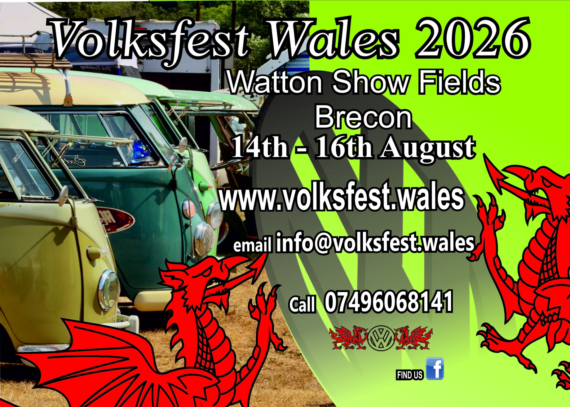VOLKSFEST WALESWatton Show FieldsBrecon14th-15th-16thAugust 2026It's our 25thanniversary and we have loads of things lined up to celebrate! FridayGates open for campers at 9am!Trade area, catering