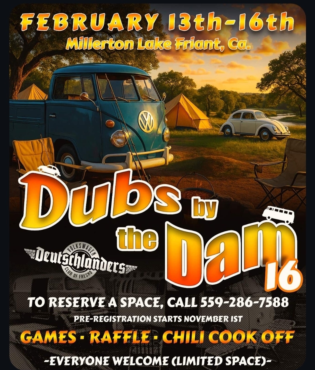 Camping is in the large group location at Millerton Lake. Park where you like inside the Camping area. The price is depending on what you bring and per vehicle, not spot. Bug, Bus or type 3 etc. and tent, $65 for the entire weekend. Vehicles with trailers and RV’s are slightly more. Again, text or call Paul Yocum for any details, 559-286-7588.