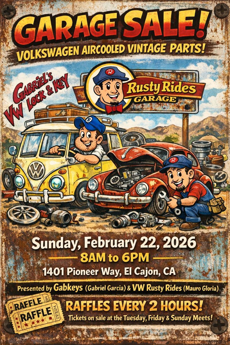 2026sun22feb8:00 amsun6:00 pmπΊπΈ Garage Sale - Volkswagen Aircooled Vintage Parts8:00 am - 6:00 pm 1404 Pioneer Way, El Cajon, California, United States