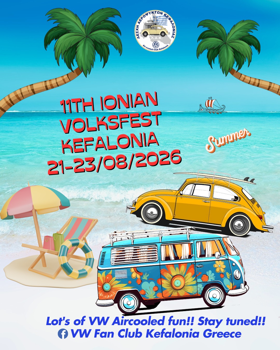 ο 11ο Ιόνιο Φεστιβάλ Αερόψυκτων VW Κεφαλονιάς έρχεται 21-23/08/2026!!Λαβαίνουμε πολλά μηνύματα που μας ρωτάνε πότε θα γίνει το επόμενο Φεστιβάλ μας, οπότε ανακοινώνουμε από τώρα, για το καλοκαίρι
